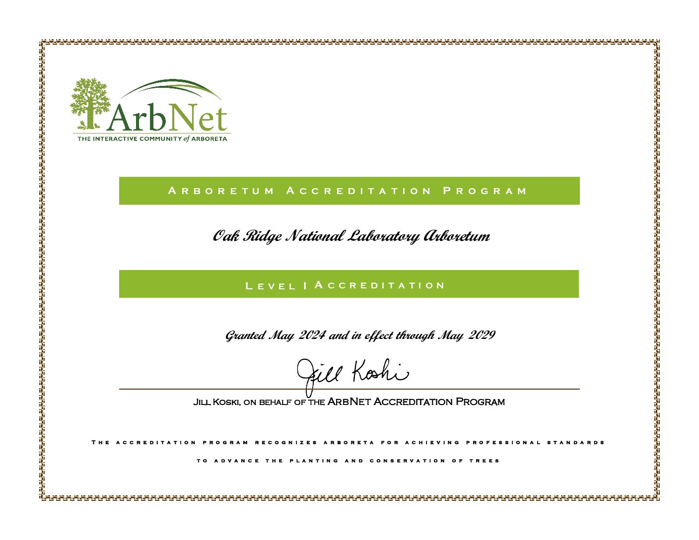 In 2019, the ORNL Arboretum was certified through the ArbNet Arboretum Accreditation Program, an internationally recognized arboretum accreditation program, as a level one arboretum. Visit the ORNL Arboretum ArbNet page to learn more about the certification and the ArbNet Program.